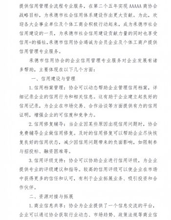 2、2019年与承德市工信局中小企业公共服务平台联合成立承德市企业信用服务中心,为承德市企事业单位提供信用管理咨询服务。