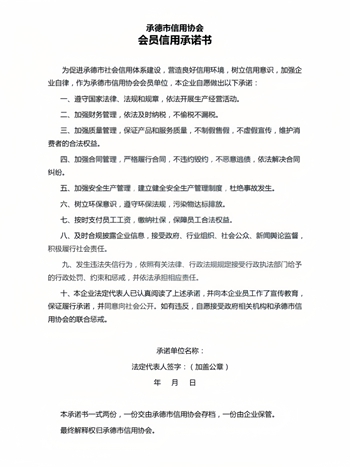遵守国家宪法、法律、法规以及国家政策、制度,遵守社会道德风尚,弘扬诚实守信精神,提高企业诚信意识和信用水平,营造有利于诚实守信企业生存和发展的社会环境,规范和促进企业健康发展,为承德市社会信用体系建设服务。