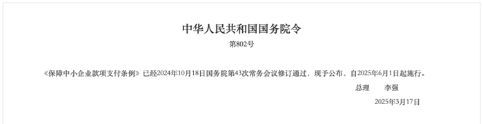 国务院公布修订后的《保障中小企业款项支付条例》,2025年6月1日起施行。2025年修订版《保障中小企业款项支付条例》新增条款及主要修订内容
