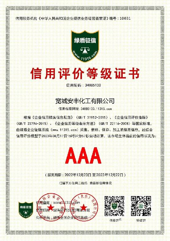 宽城安丰化工有限公司始建于1998年,现有员工38人,现有固定资产3500多万元。主要生产用于毛发染料中间体,4-氯间苯二酚30吨/年和2,6-二羟基甲苯30吨/年。生产工艺先进,公司独有生产创新技术,河北省高新企业,河北省科技中小企业,承德市高潜民营企业。公司所生产的4-氯间苯二酚和2,6-二羟基甲苯产品,产品质量优异,远销欧美及世界各地,深受国内外客商好评。承德市信用协会第一届、第二届会员单位,立信企业。信用等级:AAA。