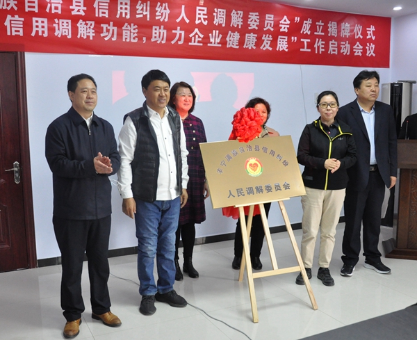 市工商联副主席祁文萍、县政协副主席王和、县司法局局长许树国、市信用协会会长王福国共同为“丰宁满族自治县信用纠纷人民调解委员会”揭牌。