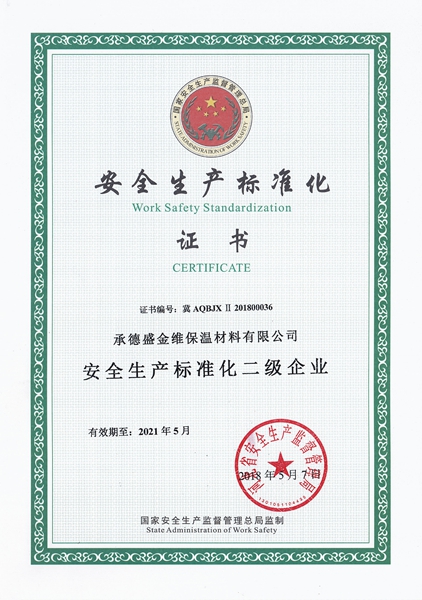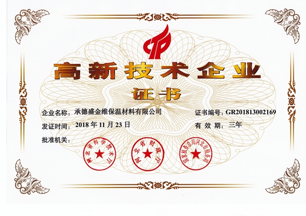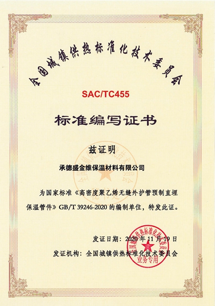 公司主导产品为:各类预制保温管,配套预制保温管件,承接各种现场保温施工。公司已通过国家ISO9001:2015质量管理体系认证、GB/T28001-2011/OHSAS18001:2007职业健康安全管理体系和ISO14001:2015环境管理体系认证。2018年11月23日,盛金维公司更是顺利通过河北省科技厅审核被认定为“高新技术企业”,2020年初被评为“AAA级信用企业”,承德市信用协会副会长单位。公司参编的GB/T39246-2020《高密度聚乙烯无缝外护管预制直埋保温管件》国家标准,由国家市场监督管理局和国家标准化管理委员会批准发布,该国标将于2021年10月起正式实施。