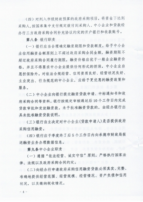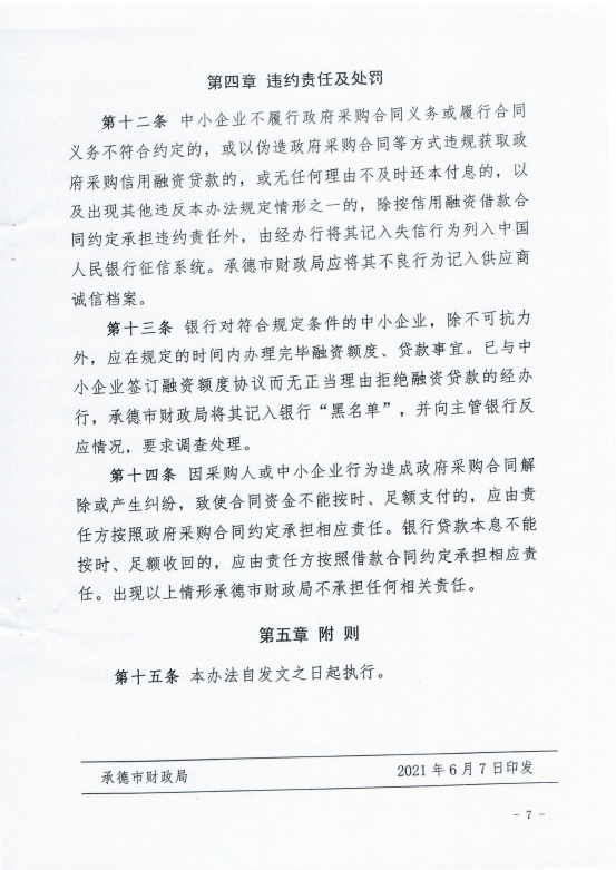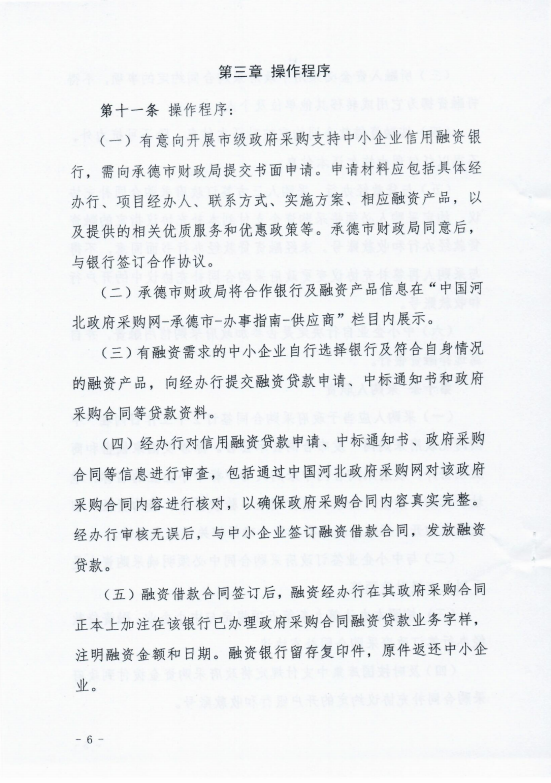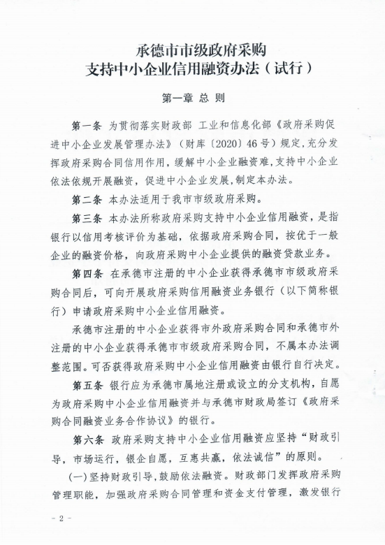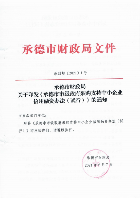 承德市财政局印发《承德市市级政府采购支持中小企业信用融资办法(试行)》
