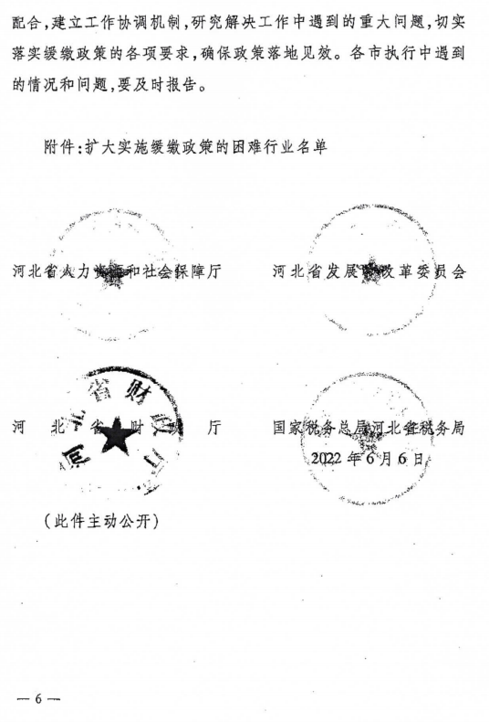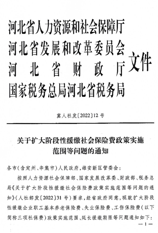 现将《河北省人力资源和社会保障厅等四部门关于扩大阶段性缓缴社会保险费政策实施范围等问题的通知》(冀人社发〔2022〕12号)转发给你们,请迅速抓好贯彻落实。