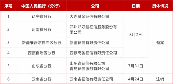 8月2日,中国人民银行4家分行分别对4家公司的企业征信业务经营备案事项进行了公示。