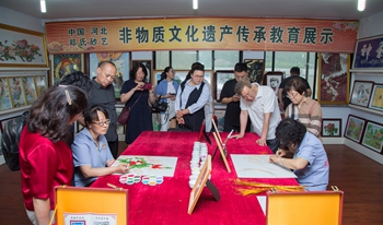 在参观体验环节,郑氏砂艺文化有限公司总经理、承德市信用协会副会长郑铁军首先向参加党课的人员介绍了非物质文化遗产——郑氏砂艺的起源和传承情况,介绍了郑氏砂艺的工艺特点、创新情况和获得的荣誉。大家参观了公司展览馆和博物馆,体验砂画非遗制作,现场感受非遗的魅力与工匠精神。大家被郑氏砂艺独特的工艺、精湛的技艺、唯美的画面所吸引,纷纷驻足端详,认真体验,无不感叹中华文化的博大精深。