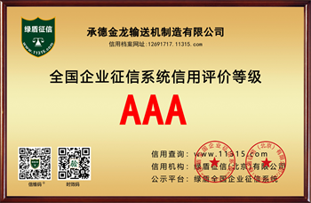 承德金龙输送机制造有限公司创建于1990年,是集项目设计、制造、安装调试、机电一体化的输送机专业生产企业,注册资金5000万元,占地面积12万平方米,现有员工270人,年产值3亿元。承德市信用协会第二届会员单位,立信企业,信誉等级:AAA。