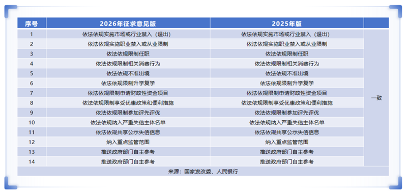 对比《清单》2026年征求意见版与2025年版,纳入的三类14项失信惩戒措施完全一致。